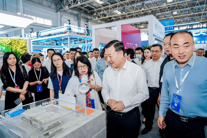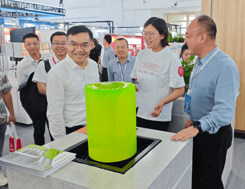 姜萬(wàn)榮副部長(zhǎng)參觀澎內(nèi)傳展臺(tái),邊聽講解、邊認(rèn)真觀看水池池壁裂縫自愈合實(shí)際應(yīng)用效果。